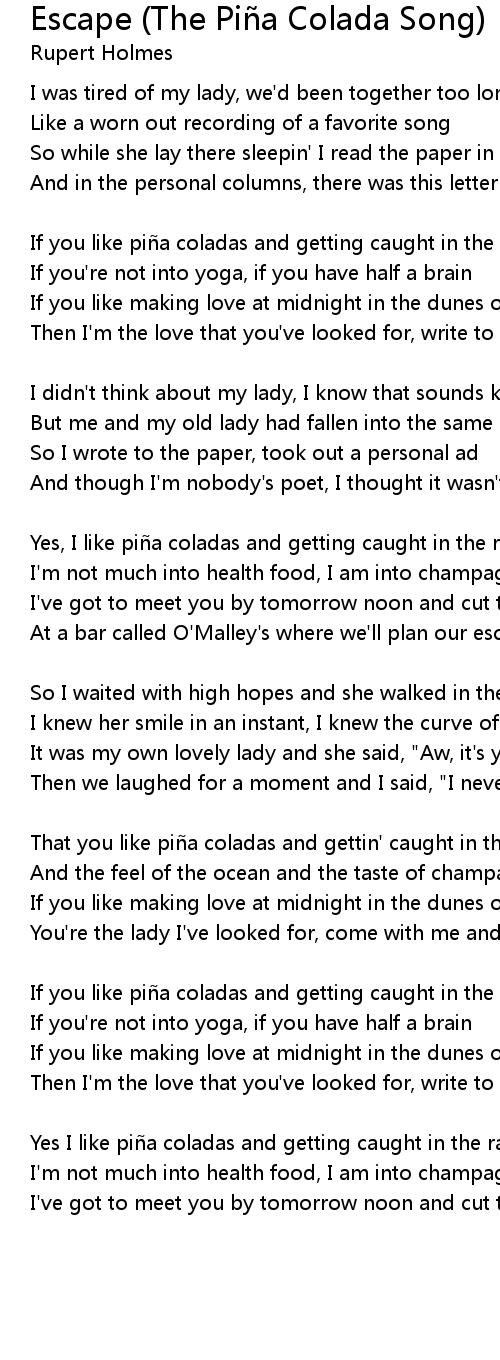 "Rupert Holmes - Escape\/The Pina Colada Song (Lyrics)", "Escape", later known as "Escape (The Piña Colada Song)", was the highest-charting hit for Rupert Holmes, released off his . This site is an open community for users to share their favorite pic on the internet, all pix or pictures in this page are for personal pix use only, it is stricly prohibited to use this pics for commercial purposes, if you are the creator and find this pics is shared without your permission, please kindly raise a DMCA report to Us.